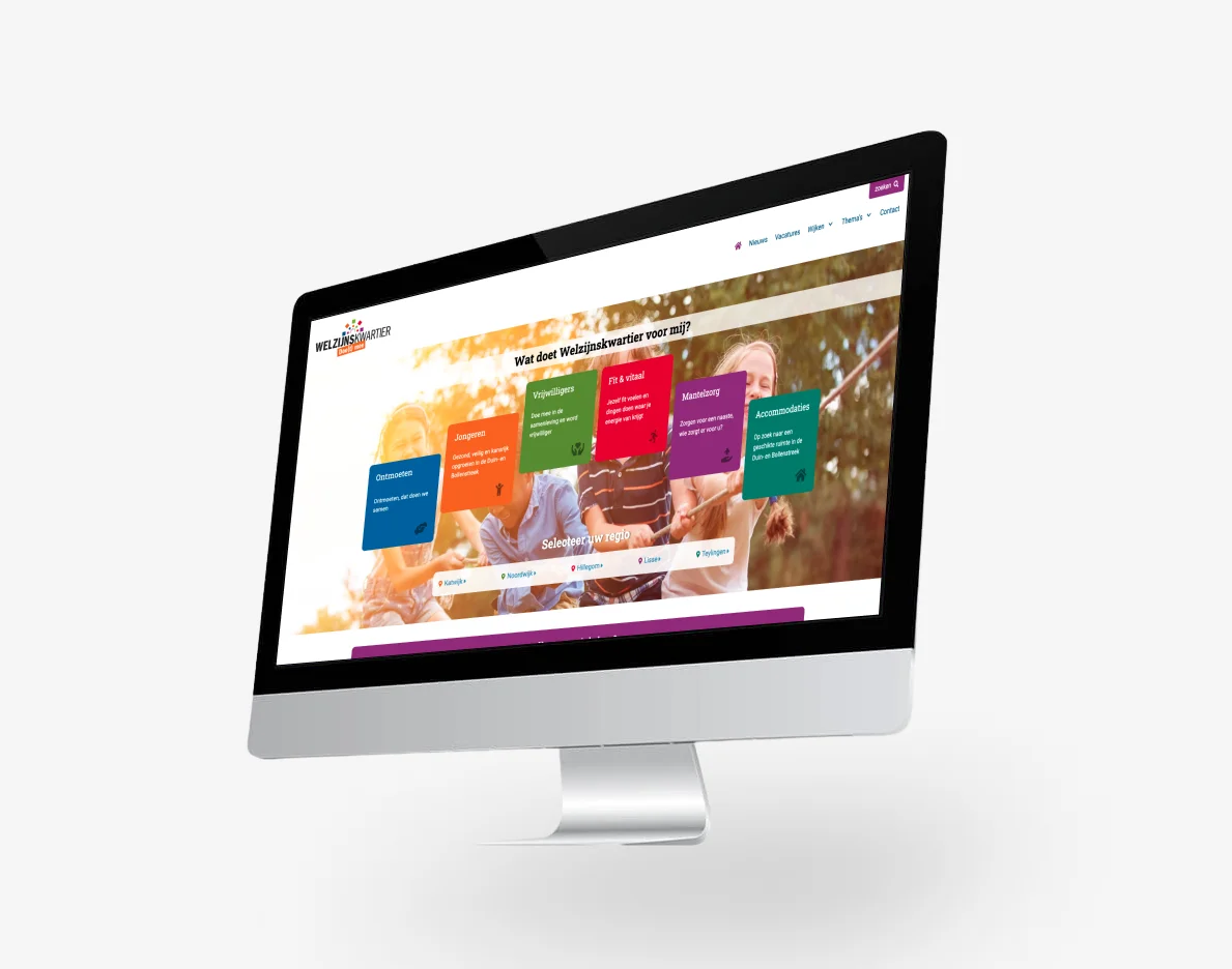 Welzijnskwartier is een organisatie die sociale participatie stimuleert, zowel voor jongeren als ouderen. Toen ze ons vroegen om een nieuwe website te maken wilden we dat uiteraard graag doen! Het uitgangspunt van deze website is het prominent doorvoeren van hun thema's. Hier is duidelijk gekozen om kleuren te koppelen aan de thema's, zodat bezoekers herkennen waar ze zijn. Door middel van gekleurde blokken zien bezoekers duidelijk dat er zes thema's zijn, zoals "vrijwilliger worden", "Mensen ontmoeten" of "Fit en vitaal worden".